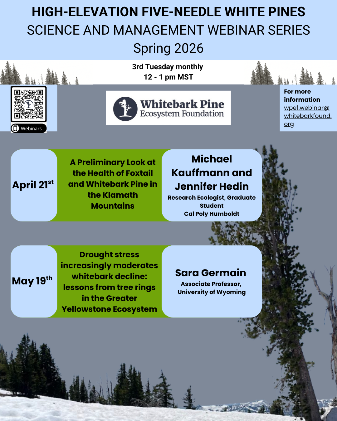 April 21, High-Elevation Five-Needle White Pines Science and Management Webinar Series, Michael Kauffmann (Research Ecologist) and Jennifer Hedin (Graduate Student), Cal Poly Humboldt: A Preliminary Look at the Health of Foxtail and Whitebark Pine in the Klamath Mountains